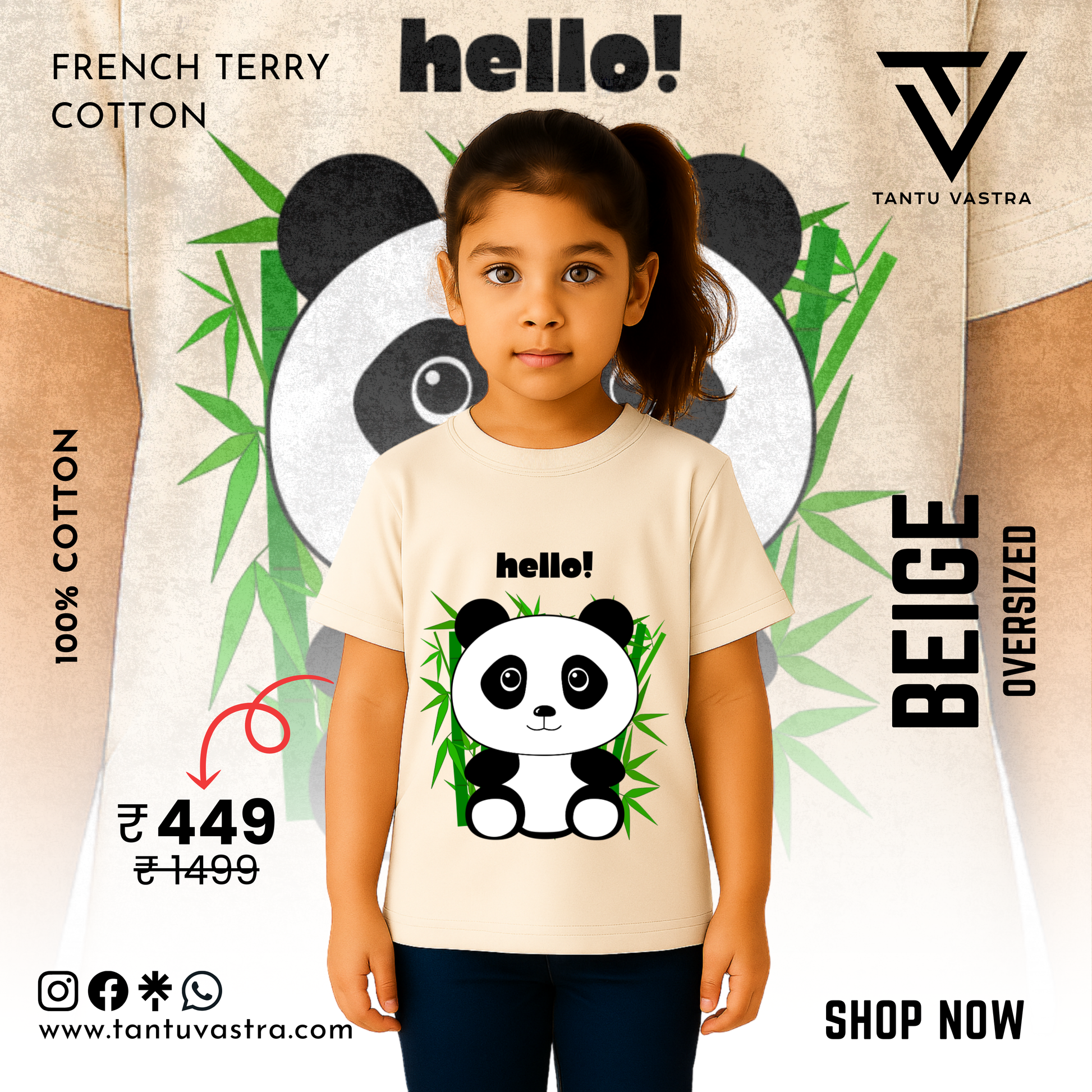 Kids Oversized French Terry Cotton T-Shirt – Hello Panda Print (Beige)