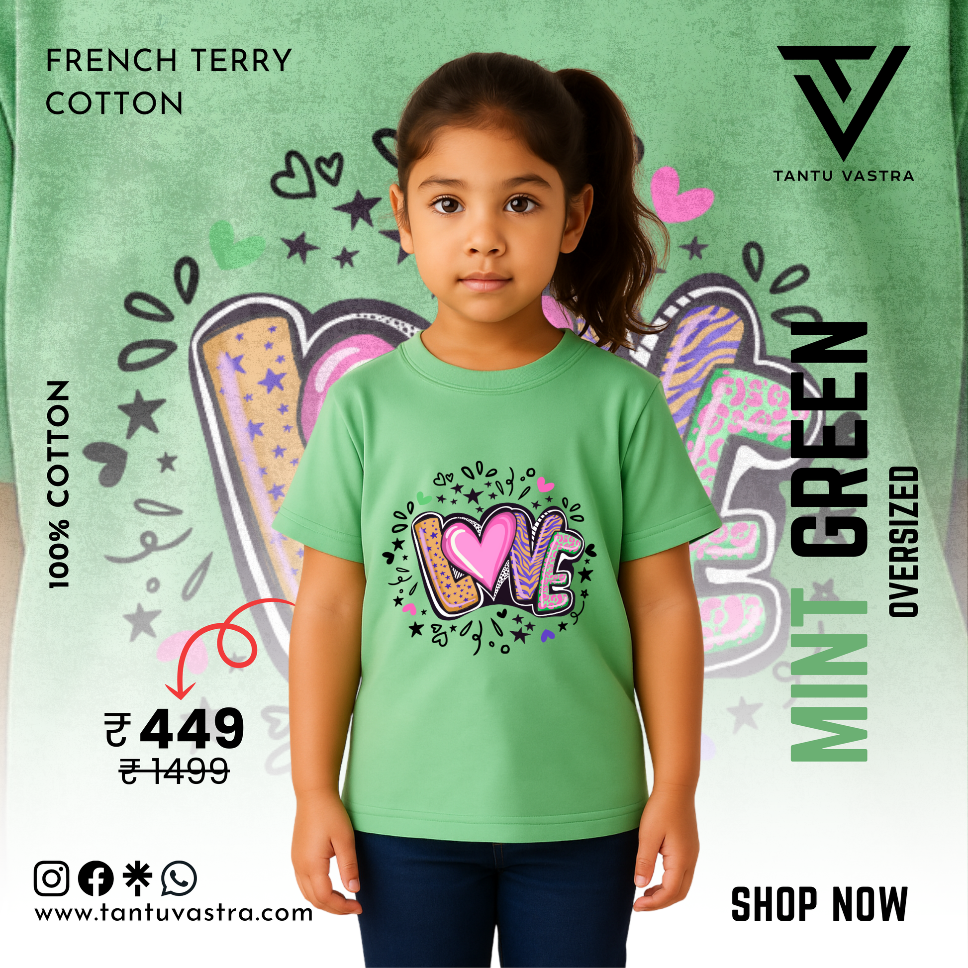 Kids Oversized French Terry Cotton T-Shirt – Love Print (Mint Green)