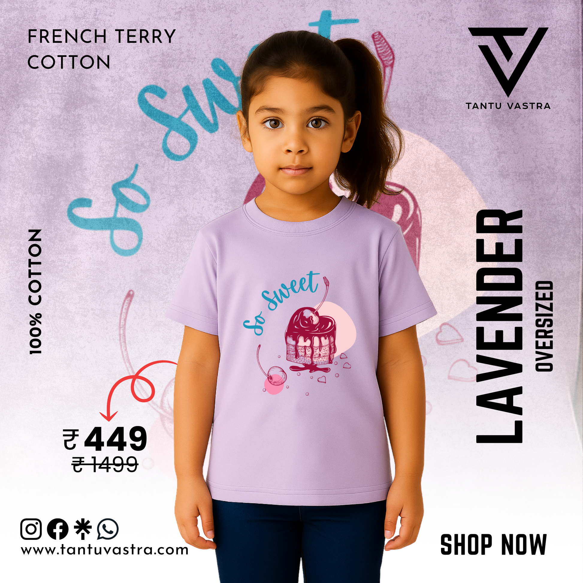 Add a playful pop of color to your kid’s wardrobe with our Premium Kids Oversized T-Shirt in Lavender featuring the fun “So Sweet Cupcake” design. Made with 100% French Terry Cotton (240 GSM), this oversized tee offers ultimate softness, breathability, and a stylish relaxed fit perfect for everyday wear.